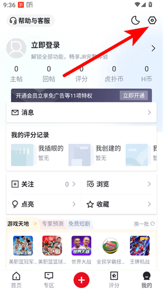 1、在虎扑首页,点击右下角我的选项,进入个人中心页面。