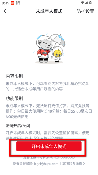 4、在未成年人模式界面,点击开启未成年人模式按钮,即可开启虎扑未成年模式。