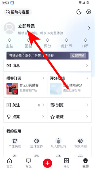 1、在虎扑首页,点击右下角我的选项,进入个人中心页面。
