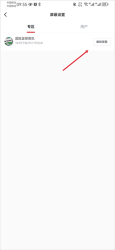 5、屏蔽设置中分为专区和用户,大家可以分别在这里看见自己屏蔽的内容,想要解除,直接点击【解除屏蔽】即可成功解除,就能再次该号发布的内容了。