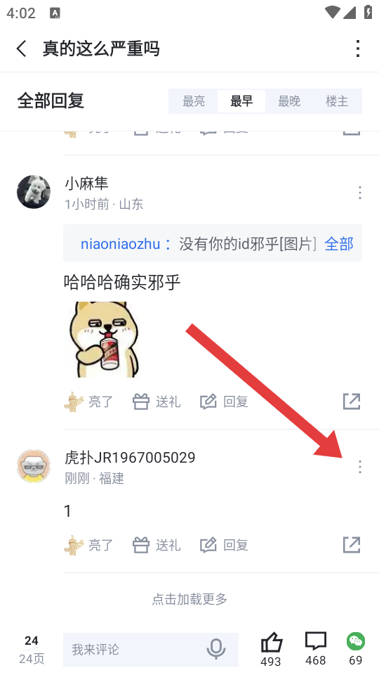2、在帖子的评论区中,找到自己的评论,点击评论右侧的…图标,弹出操作选项菜单。