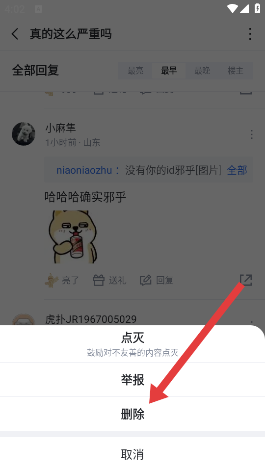 3、在弹出的选项菜单中,我们点击删除,即可删除自己发布的这条评论。
