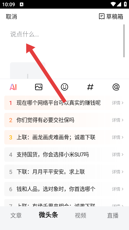 1、进入app首页后,在头条首页的顶部,需要点击红色发布的按钮,进入内容创作的编辑界面。