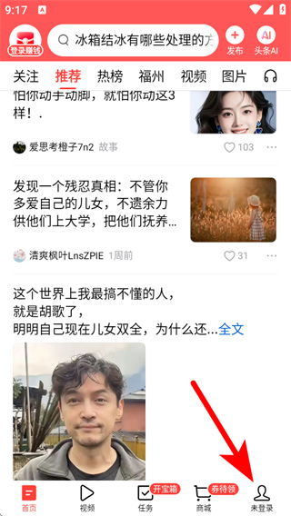 1、打开今日头条APP,点击底部未登录,进入登录的界面。