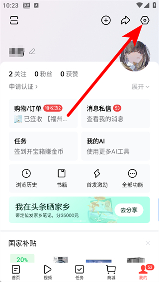 2、在个人页面中,点击右上角的设置图标,进入设置页面。