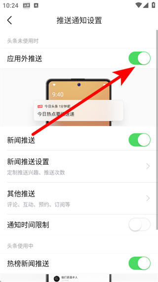 4、在页面找到应用外推送选项,将其开关关闭,即可完成关闭操作。