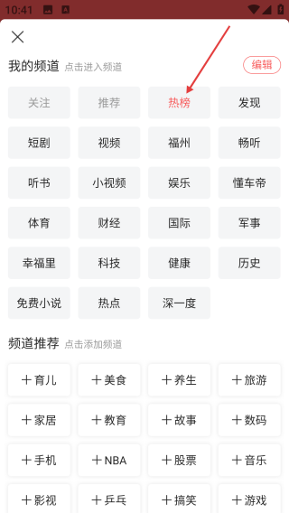 2、点击进入后,在我的频道里快速找到热榜新闻频道,点击热榜频道进行添加。