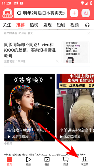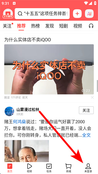 1、打开今日头条APP,点击底部导航栏的未登录,进入个人页面。