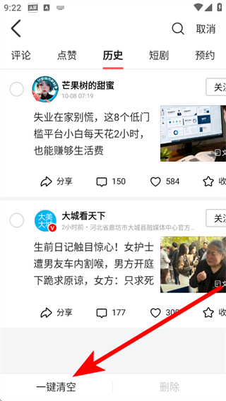 4、进入编辑模式后,点击底部一键清空,即可删除历史记录。