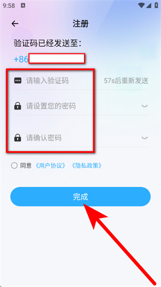 4、输入验证码、设置密码,勾选相关协议后,点击完成,完成账号注册操作。