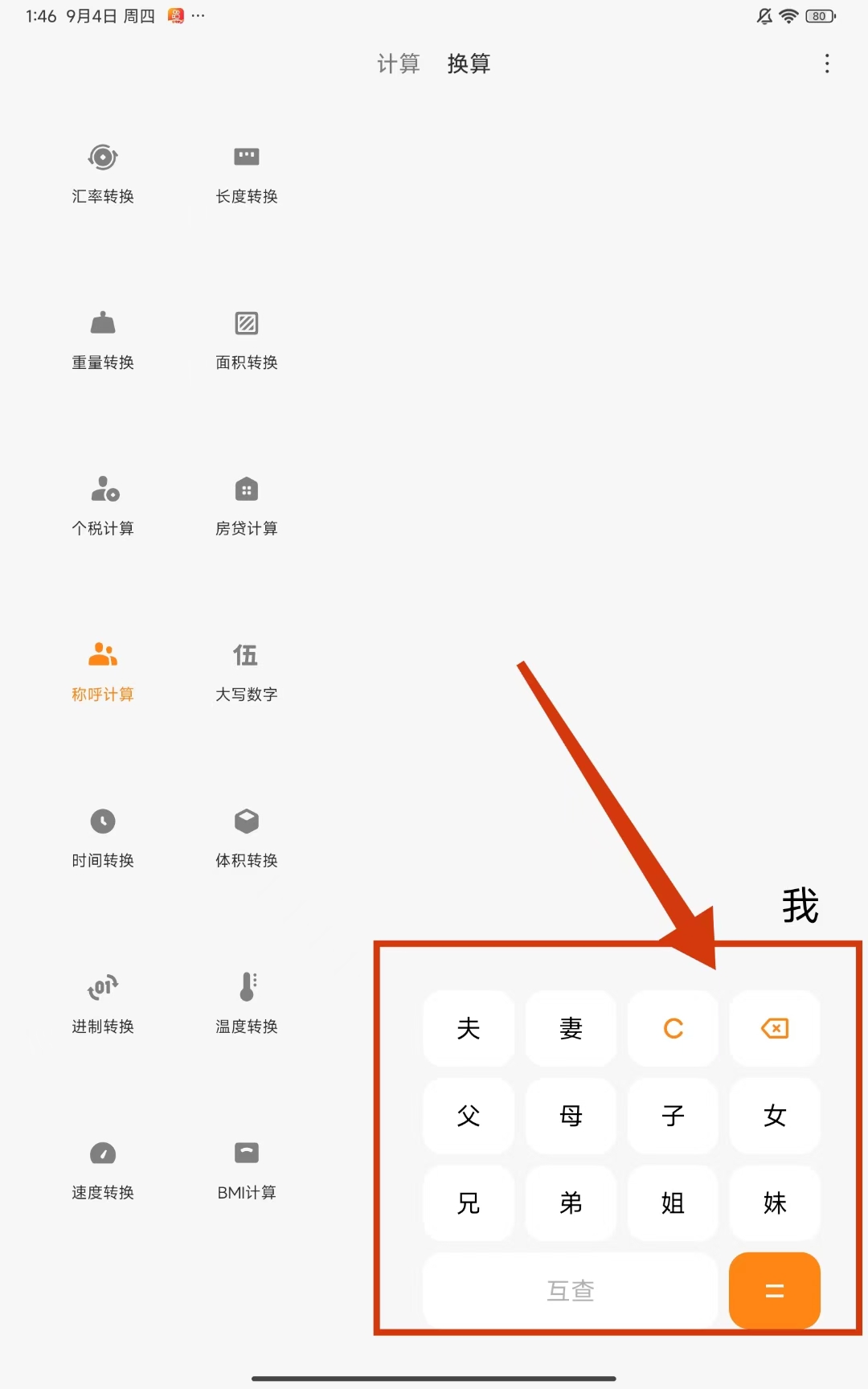 3、在称呼计算界面,点击相应的亲属称呼按键,输入已知称呼后,点击互查或等于号按钮,就能得出对应的亲属称呼。