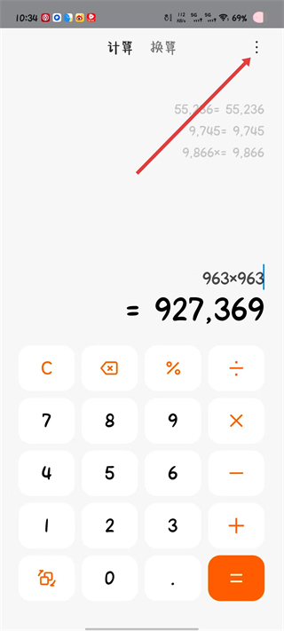 1、打开小米计算器软件,进入计算页面后点击右上角的三点按钮。