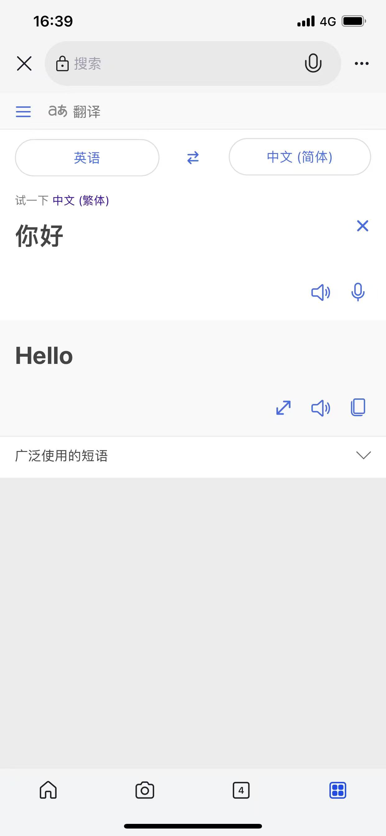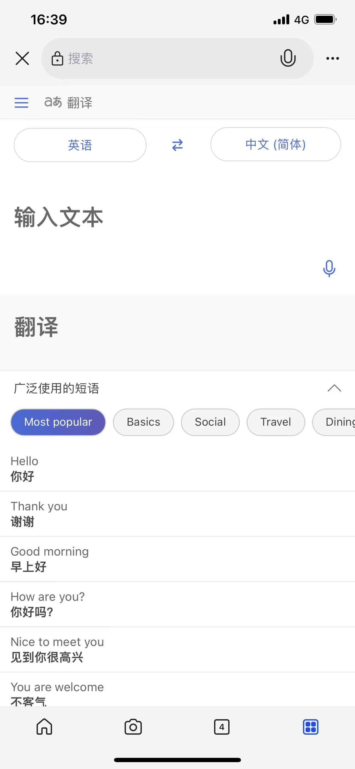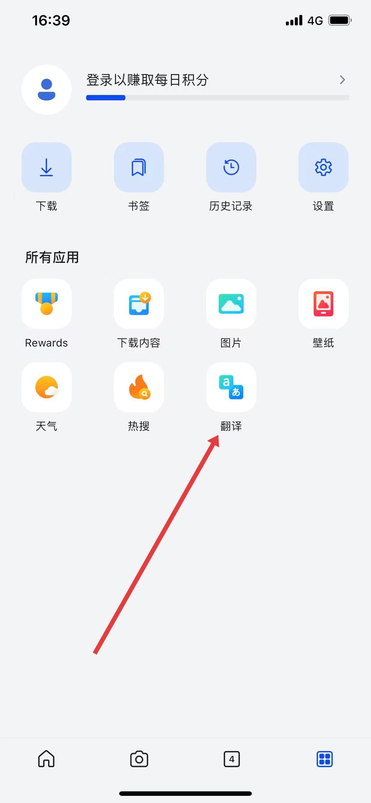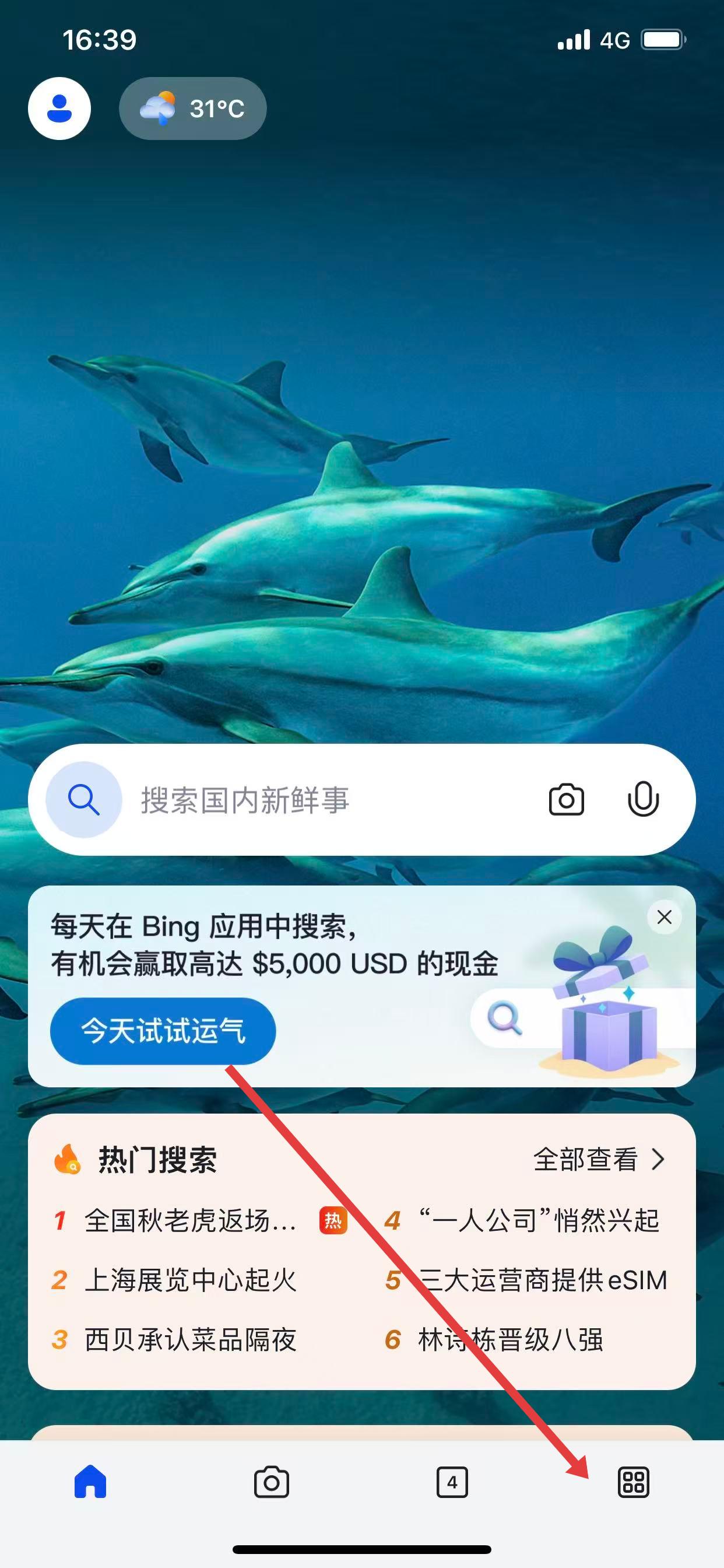 1、打开微软必应应用,点击底部导航栏右侧类似九宫格的应用图标。