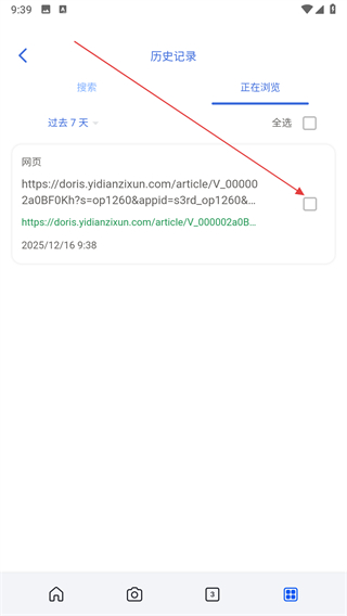 3、在历史记录页面中找到要删除的浏览记录,点击记录右侧的选择框选中。