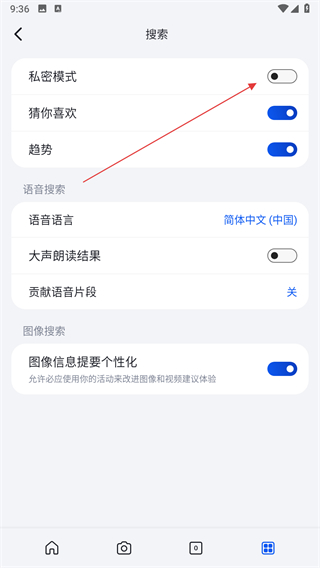 4、在搜索设置页面里找到私密模式选项,点击对应的开关按钮完成开启。