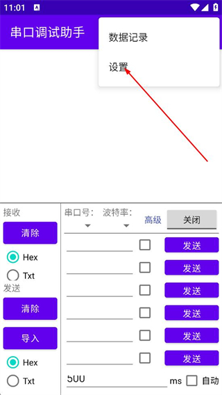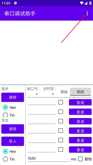 1、在串口调试助手主界面,点击右上角的三点按钮,弹出操作菜单。