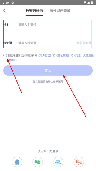 3、在登录页面,输入手机号、验证码,勾选用户协议和隐私政策,点击登录。