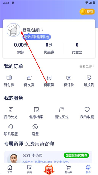 1、打开1药网app首页,点击底部导航栏的我的选项,进入个人中心页面。
