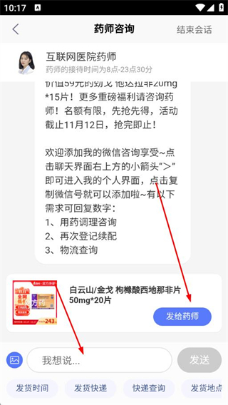 3、点击发给药师按钮发送药品信息,输入用药问题,点击发送向药师咨询。