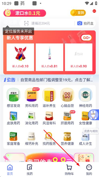 1、打开1药网app,进入首页,点击底部导航栏中的我的选项。