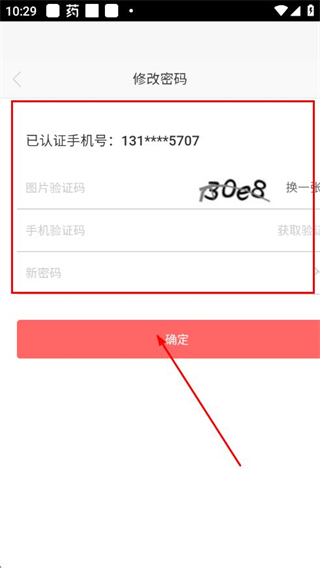 6、在密码修改信息填写页面,输入图片验证码、手机验证码和新密码后,点击确定完成密码修改。