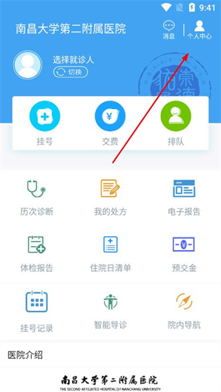 1、打开南昌大学第二附属医院app首页,点击右上角个人中心,进入用户登录页面。