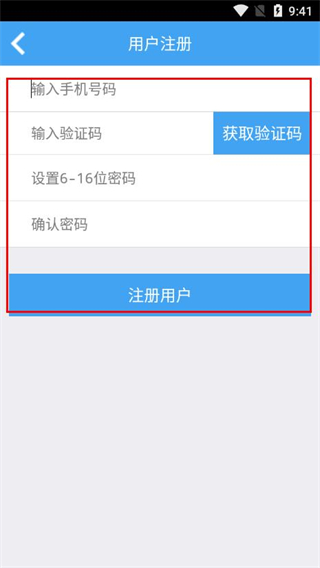 3、在注册页面填写手机号码、获取并输入验证码,设置密码后,点击注册用户完成账号注册。