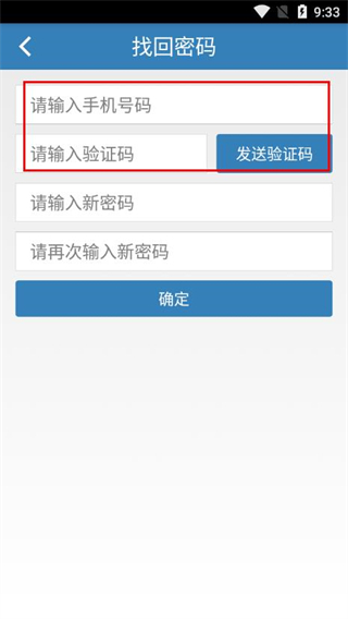 2、在找回密码页面,先输入注册的手机号码,点击发送验证码并填写收到的验证码。