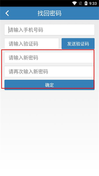 3、输入新密码并再次确认新密码后,点击确定,完成密码找回操作。