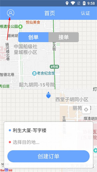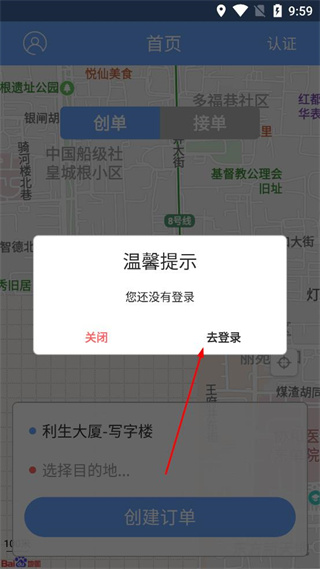 1、进入大师APP首页,点击创单选项,触发未登录的温馨提示弹窗。
