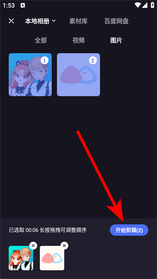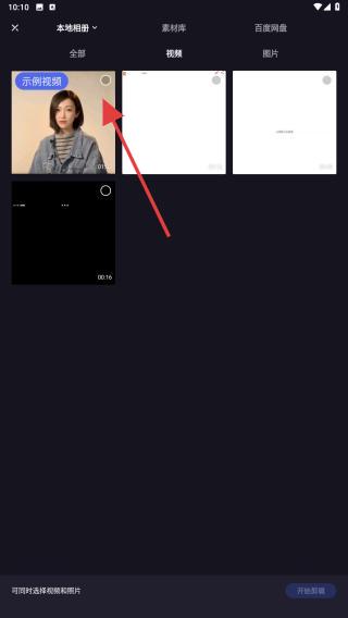 2.在素材选择界面,选择需要作为主画面的视频或图片,点击开始剪辑按钮进入剪辑界面。