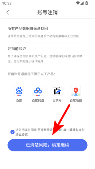 4、在账号注销页面,阅读并勾选同意相关协议后,点击已清楚风险,确定继续按钮,按提示完成账号注销操作。