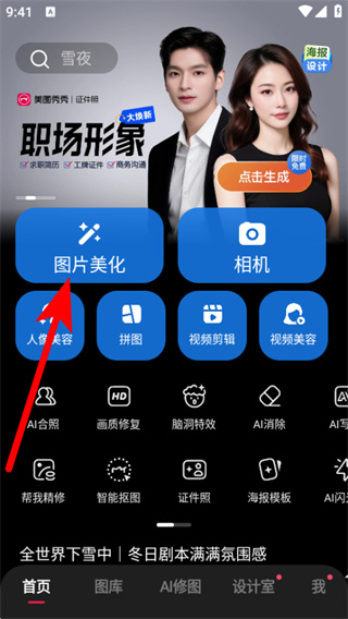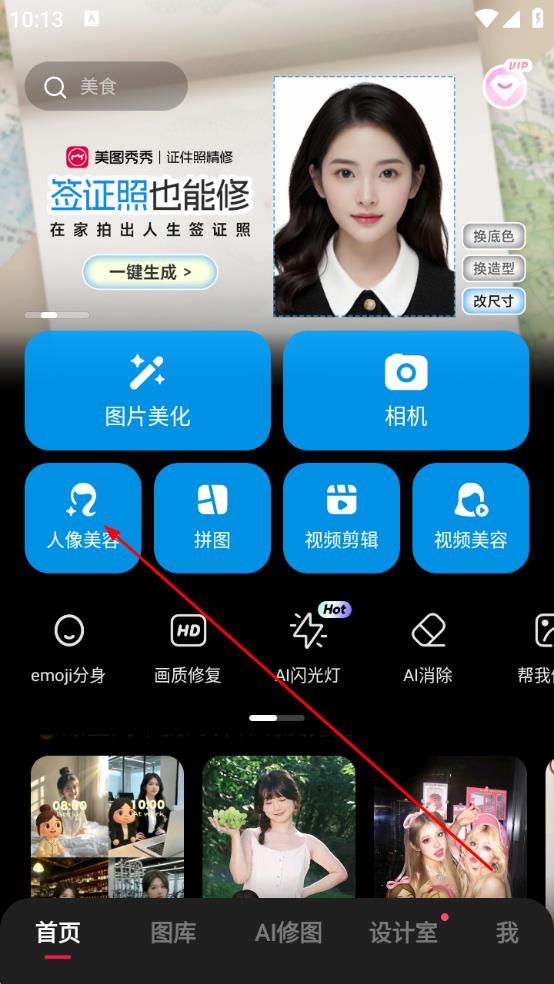 1、打开美图秀秀APP,在首页点击人像美容功能按钮,进入人像美容操作流程。