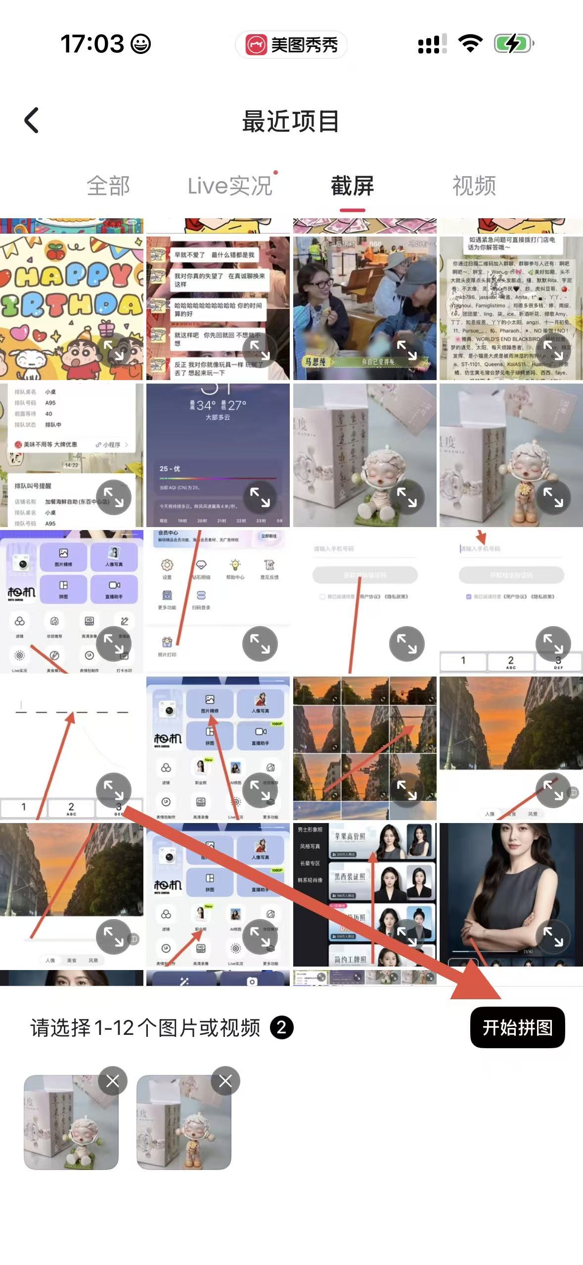 2、在图片选择页面,从最近项目里挑选1-12个想要拼接的图片或视频,点击开始拼图。