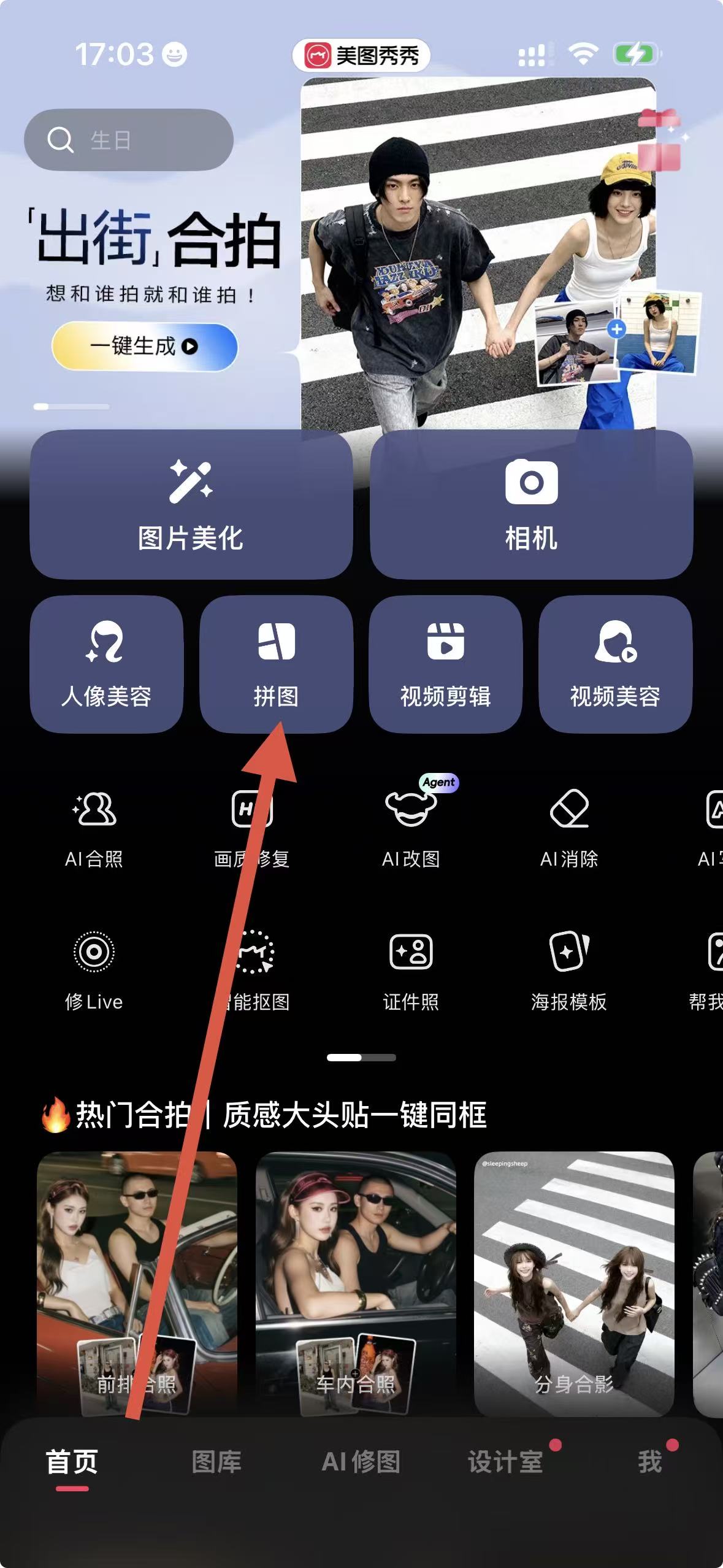 1、打开美图秀秀进入首页,点击拼图选项,进入图片选择页面。