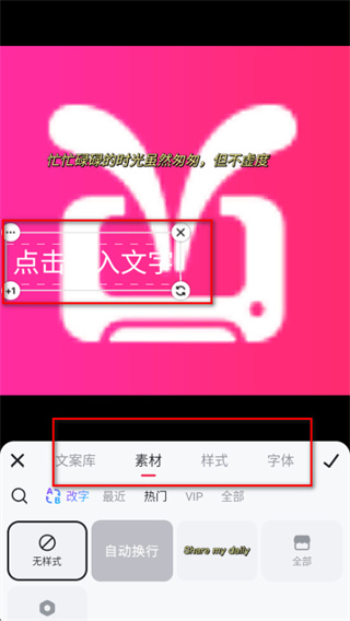 4、在文字编辑界面,点击输入框输入文字,还可在文案库、素材、样式、字体中选择设置,完成后确认即可为图片添加文字。