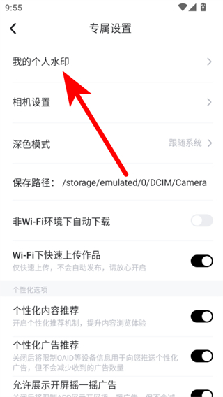 4、在专属设置页面,点我的个人水印选项,进入水印选择页面。