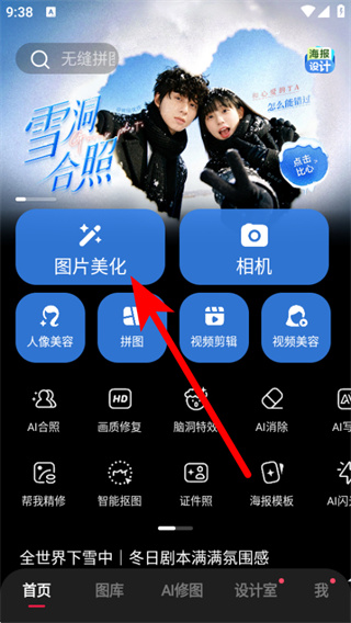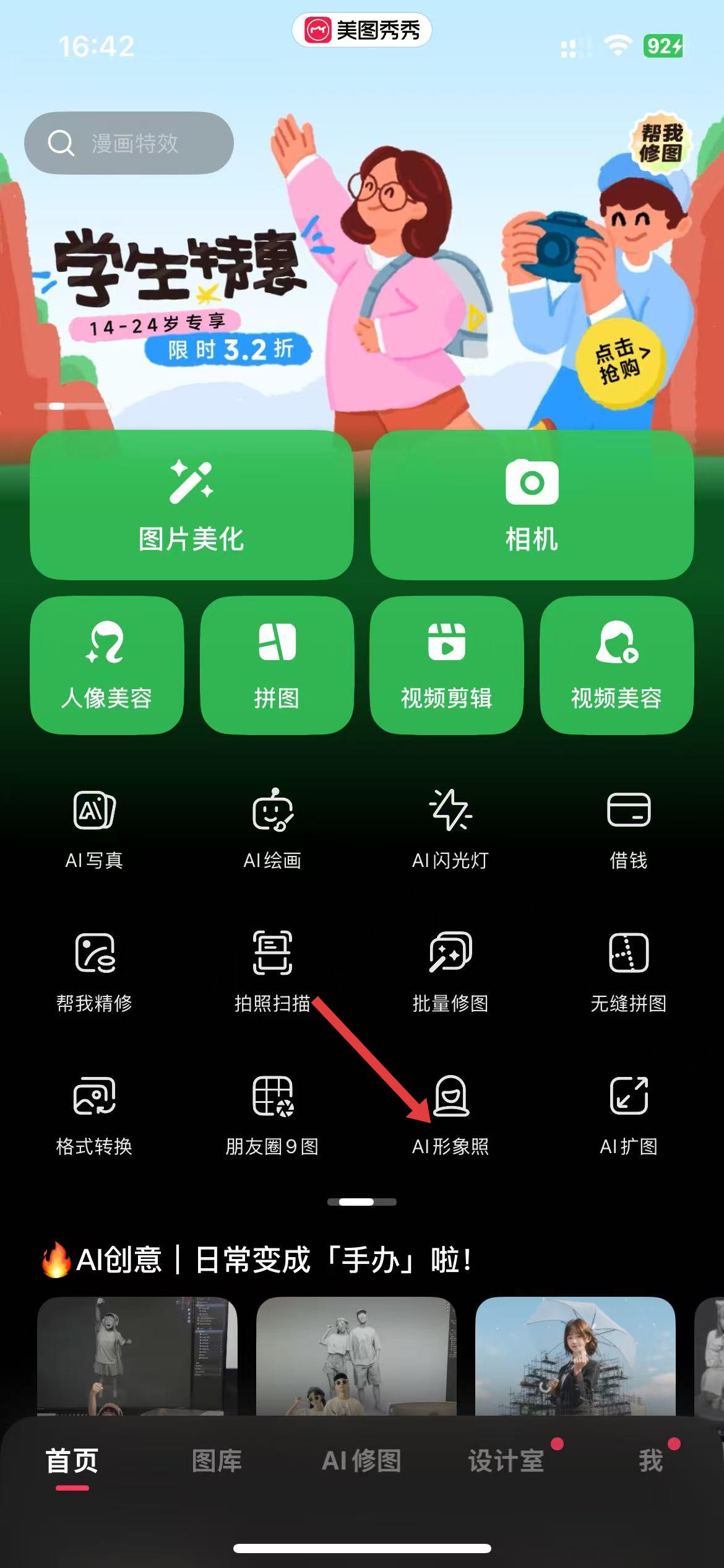 1、打开美图秀秀App,进入首页界面,在功能选项中找到并点击AI形象照。