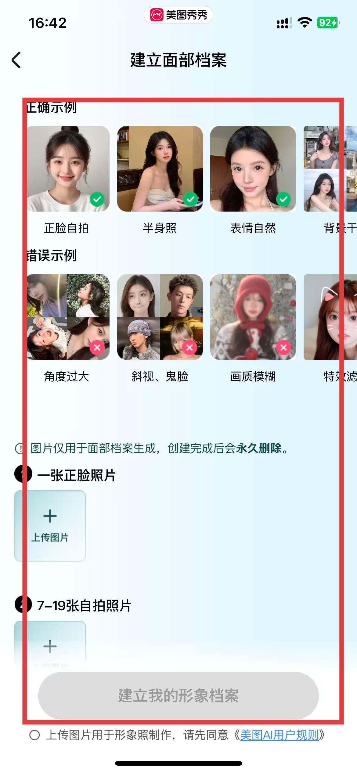 2、进入建立面部档案界面,按照页面提示上传照片,点击建立我的形象档案。
