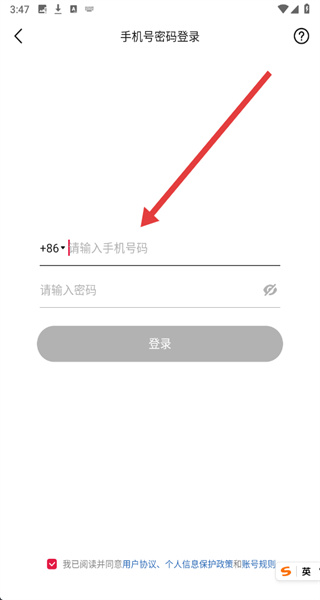 4、在切到手机号密码登录页面中,可以点击输入框依次填写手机号和密码后,即可完成登录操作。