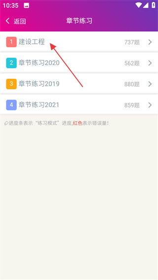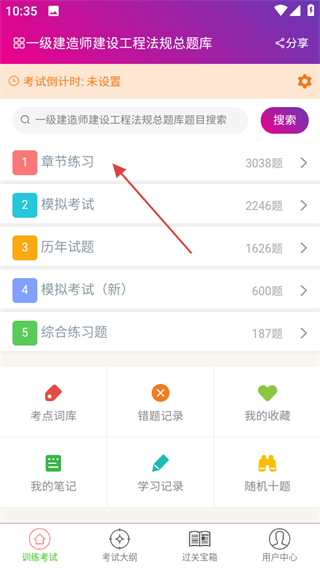 1、在一级建造师建设工程法规总题库首页,点击章节练习选项,进入章节分类页面。