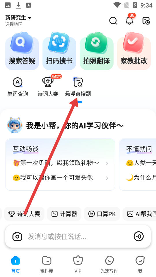 1、打开作业帮APP,在首页找到并点击悬浮窗搜题图标。