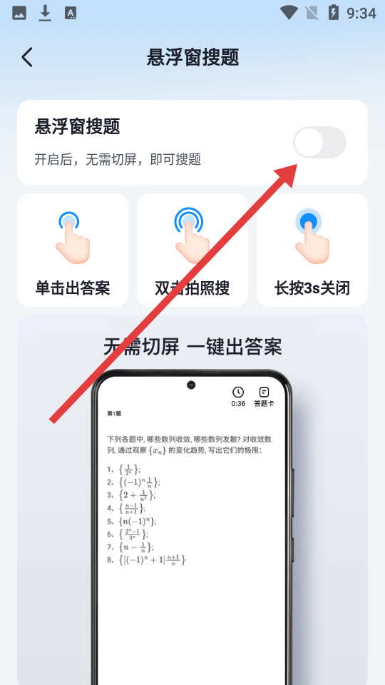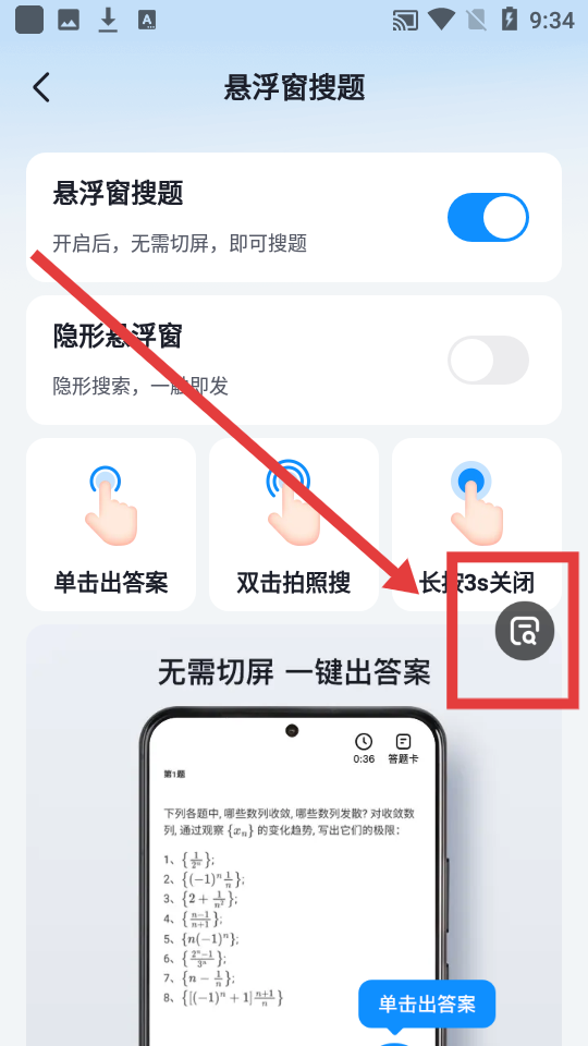 3、开启后,根据需求选择搜题操作方式,如单击出答案、双击拍照搜等。