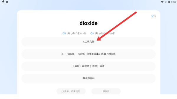 3、进入背单词界面,查看dioxide的音标、释义如n.二氧化物,通过认读、理解,完成该单词的学习记忆,提升词汇储备。