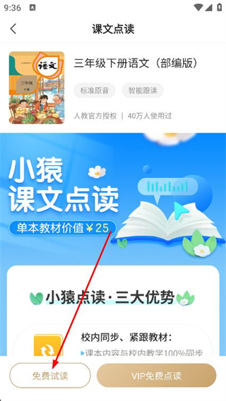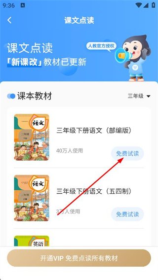2、进入课文点读页面后,选择教材版本右侧的免费试读。