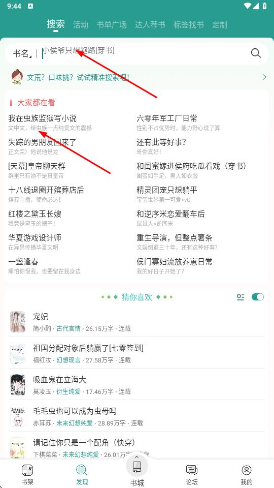 1、点击底部发现图标,进入页面后,可在搜索栏输入书名如小侯爷只想跑路[穿书]精准查找,或浏览大家都在看推荐列表如《我在虫族监狱写小说》。