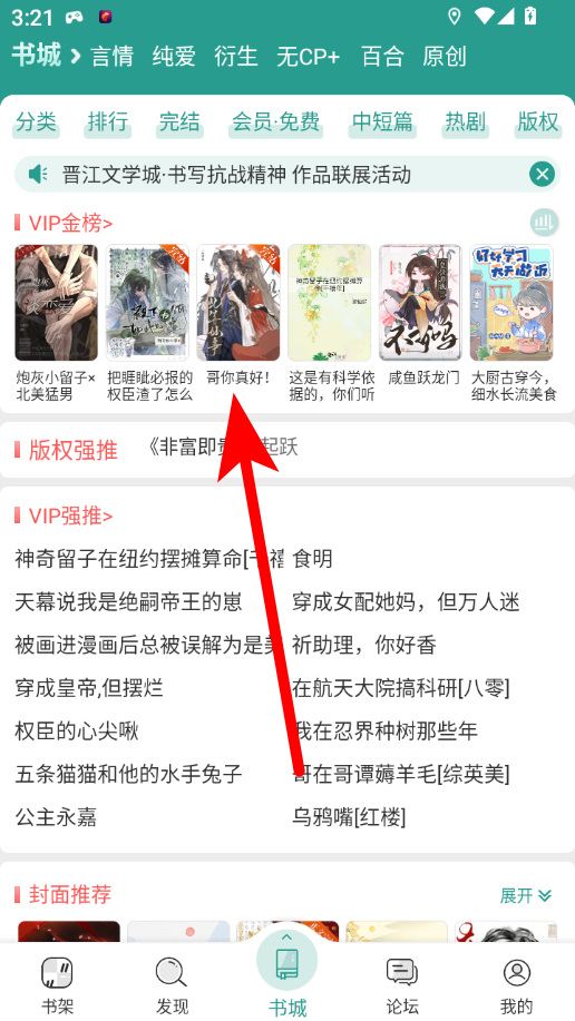 1、在晋江小说阅读APP书城页面,点击想要阅读的小说,进入小说详情页面。