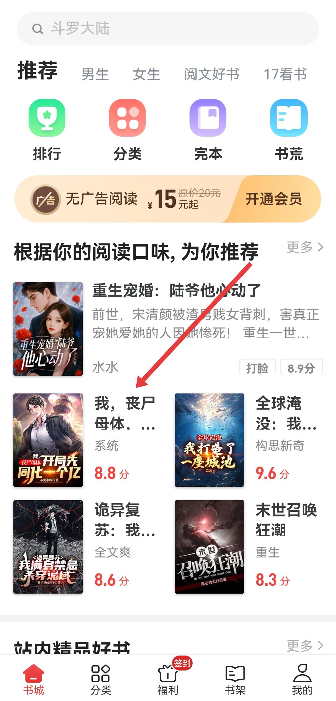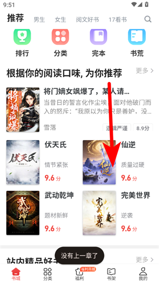 1、在追书神器书城页面,选择要分享的小说,点击进入书籍阅读界面。