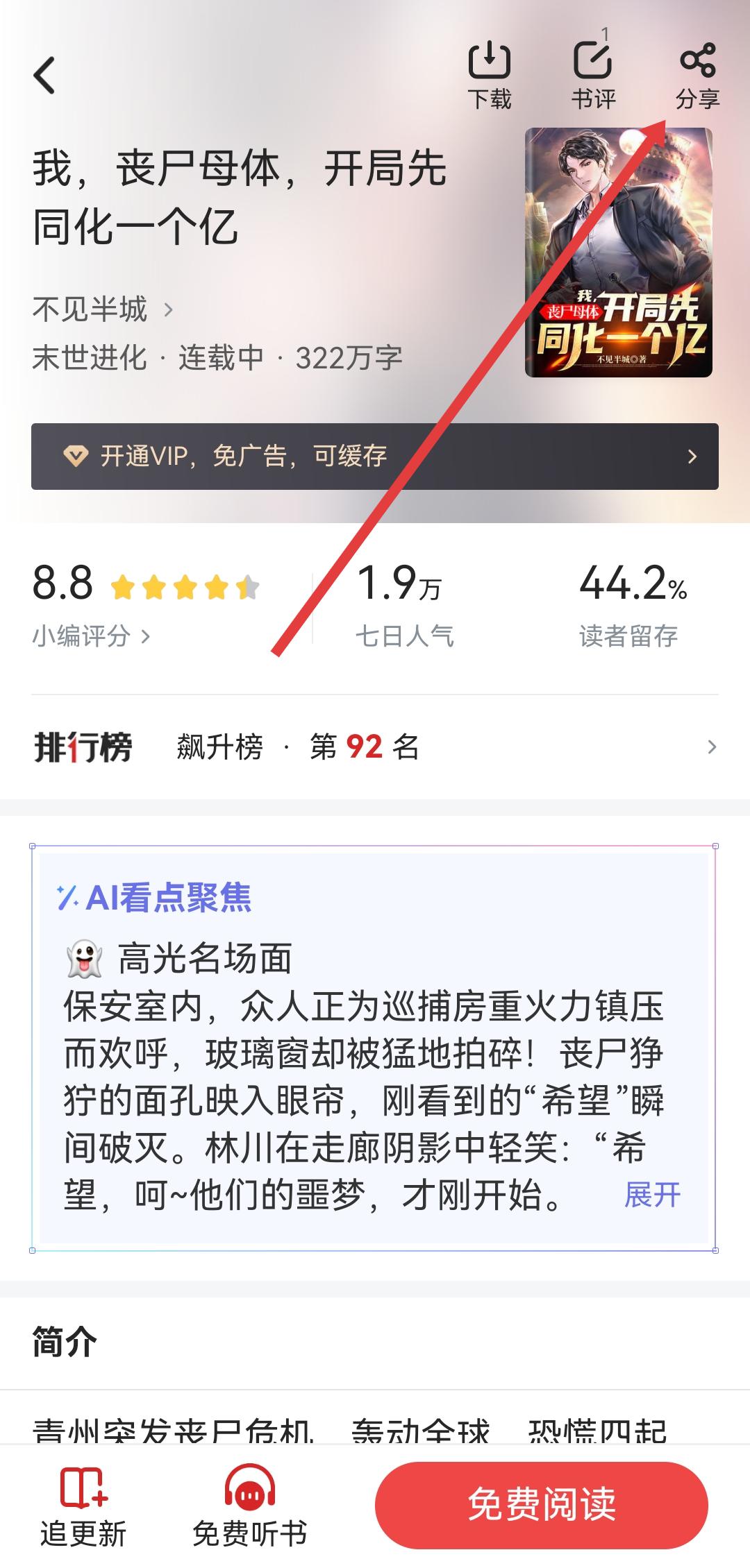 2、在小说详情页面,点击免费阅读选项,进入小说阅读界面。