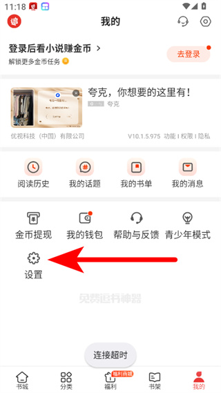 1、在追书神器我的页面,点击设置选项,进入设置页面。